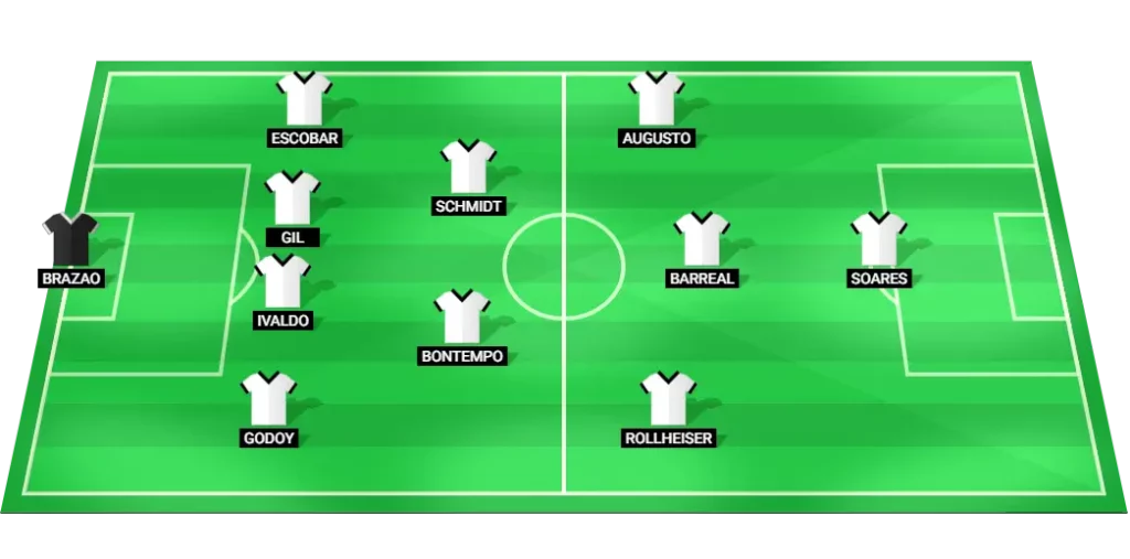 Santos Predicted Lineup (4-2-3-1): Brazao (GK), Godoy (DF), Ivaldo (DF), Gil (DF), Escobar (DF), Bontempo (MF), Schmidt (MF), Barreal (MF), Rollheiser (MF), Augusto (MF), Soares (FW)