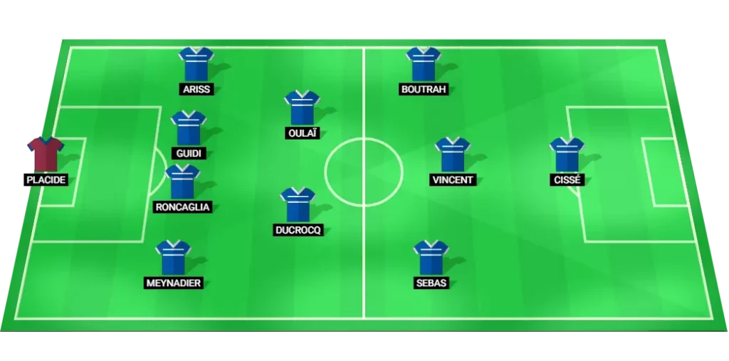 Bastia are likely to stick with their 4-2-3-1 formation, relying on home support to drive their attack: Placide (GK), Meynadier (DF), Roncaglia (DF), Guidi (DF), Ariss (DF), Ducrocq (MF), Oulaï (MF), Sebas (MF), Vincent (MF), Boutrah (MF), Cissé (FW).