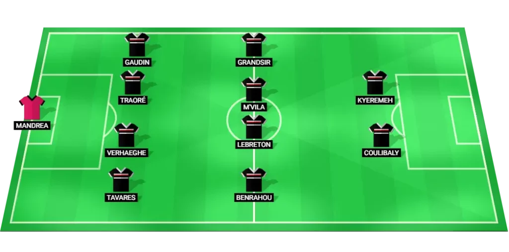 Caen’s 4-4-2 setup will aim to balance defense and attack despite their injury concerns: Mandrea (GK), Tavares (DF), Verhaeghe (DF), Traoré (DF), Gaudin (DF), Benrahou (MF), Lebreton (MF), M’Vila (MF), Grandsir (MF), Coulibaly (FW), Kyeremeh (FW).
