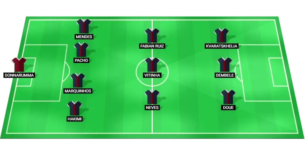 PSG (4-3-3): Donnarumma (GK), Hakimi (DF), Marquinhos (DF), Pacho (DF), Mendes (DF), Neves (MF), Vitinha (MF), Fabian Ruiz (MF), Doue (FW), Dembele (FW), Kvaratskhelia (FW)