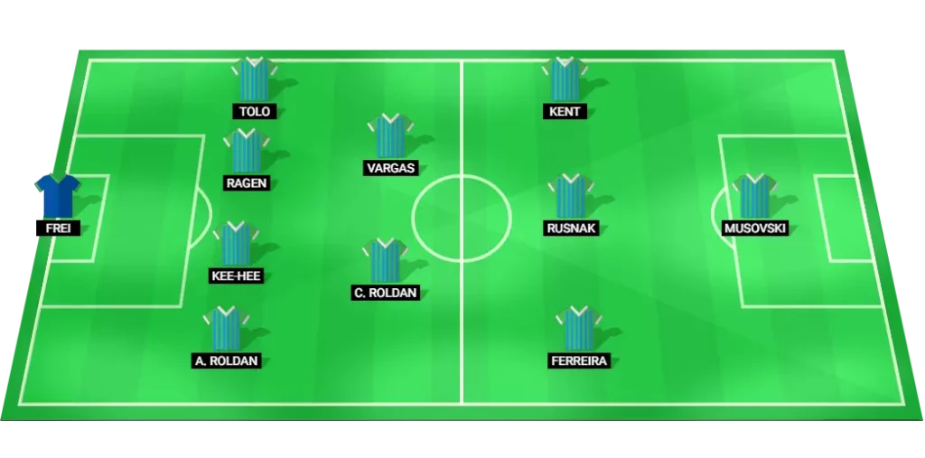 Seattle Sounders (4-2-3-1): Frei (GK), A. Roldan (DF), K. Kee-Hee (DF), Ragen (DF), Tolo (DF), C. Roldan (MF), Vargas (MF), Ferreira (MF), Rusnak (MF), Kent (MF), Musovski (FW)