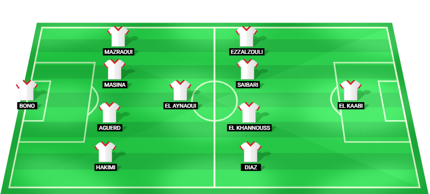 Bono (GK), Hakimi (DF), Aguerd (DF), Masina (DF), Mazraoui (DF), El Aynaoui (MF), Diaz (MF), El Khannouss (MF), Saibari (MF), Ezzalzouli (MF), El Kaabi (FW).