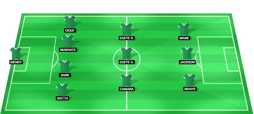 Mendy (GK), Diatta (DF), Sarr (DF), Niakhate (DF), Diouf (DF), Camara (MF), Gueye A. (MF), Gueye R. (MF), Ndiaye (FW), Jackson (FW), Mane (FW).