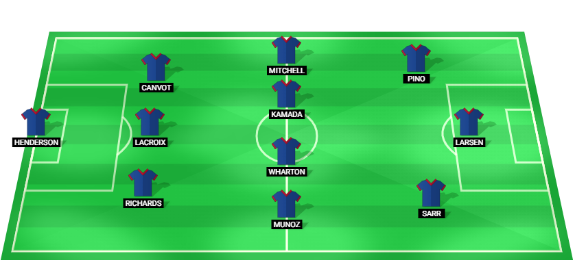 Henderson (GK), Richards (DF), Lacroix (DF), Canvot (DF), Munoz (MF), Wharton (MF), Kamada (MF), Mitchell (MF), Sarr (FW), Larsen (FW), Pino (FW).