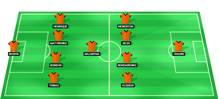 Riznyk (GK), Tobias (DF), Bondar (DF), Matviienko (DF), Henrique (DF), Nazaryna (MF), Alisson (MF), Bondarenko (MF), Silva (MF), Newerton (MF), Traore (FW).