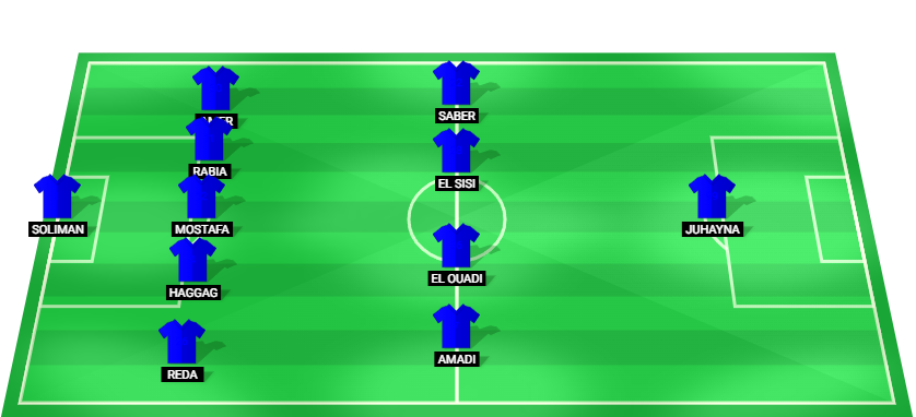 Soliman (GK), Reda (DF), Haggag (DF), Mostafa (DF), Rabia (DF), Amer (DF), Amadi (MF), El Ouadi (MF), El Sisi (MF), Saber (MF), Juhayna (FW)