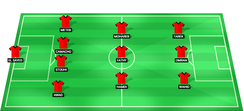 El Sayed (GK), Awad (DF), Stouhi (DF), Camacho (DF), Meteb (DF), Hamdi (MF), Fathy (MF), Mohareb (MF), Wahid (FW), Omran (FW), Tarek (FW)