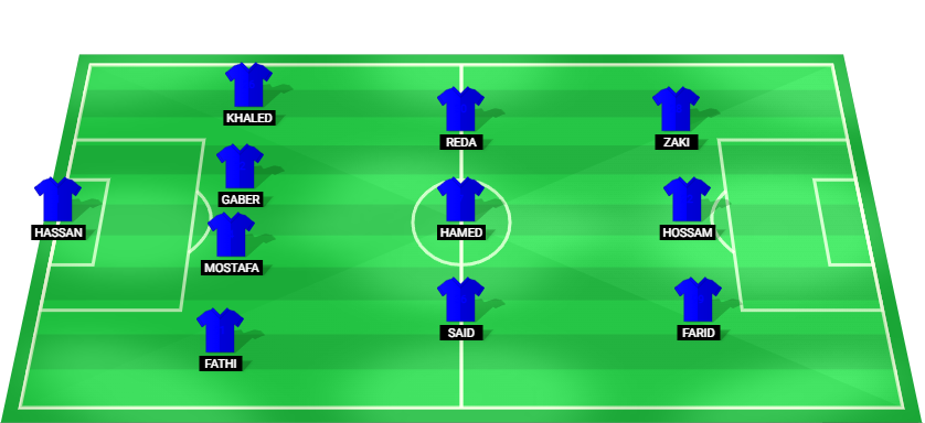 Hassan (GK), Fathi (DF), Mostafa (DF), Gaber (DF), Khaled (DF), Said (MF), Hamed (MF), Reda (MF), Farid (FW), Hossam (FW), Zaki (FW).