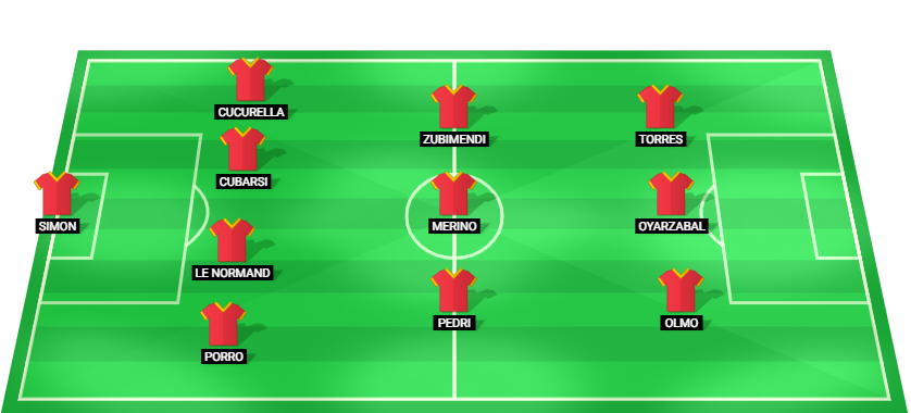 Simon (GK), Porro (DF), Le Normand (DF), Cubarsi (DF), Cucurella (DF), Pedri (MF), Merino (MF), Zubimendi (MF), Olmo (FW), Oyarzabal (FW), Torres (FW)