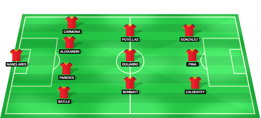Nanclares (GK), Batlle (DF), Paredes (DF), Aleixandri (DF), Carmona (DF), Bonmatí (MF), Guijarro (MF), Putellas (MF), Caldentey (FW), Pina (FW), Gonzalez (FW)