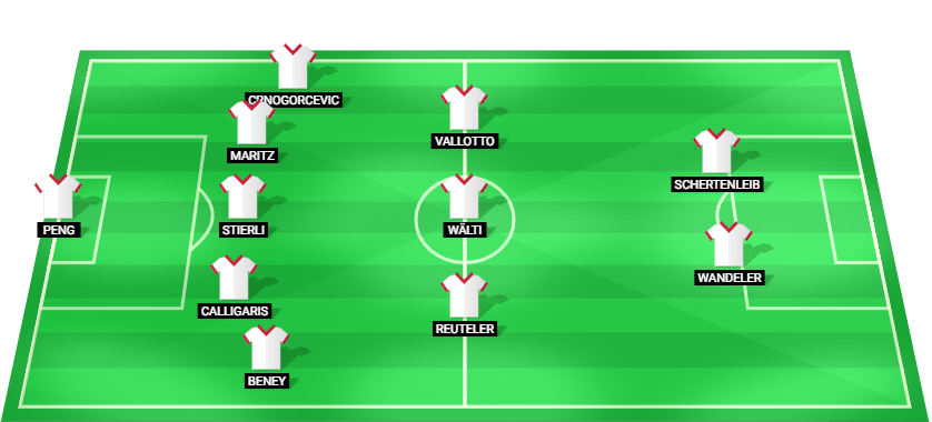 Peng (GK), Beney (DF), Calligaris (DF), Stierli (DF), Maritz (DF), Crnogorcevic (DF), Reuteler (MF), Wälti (MF), Vallotto (MF), Wandeler (FW), Schertenleib (FW)