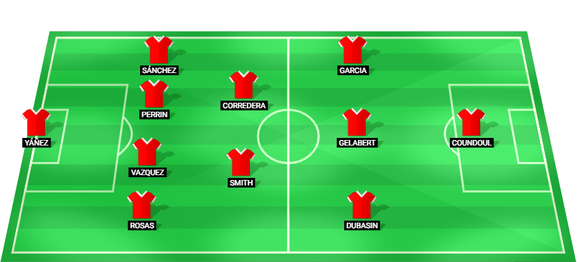 Yanez (GK), Rosas (DF), Vazquez (DF), Perrin (DF), Sanchez (DF), Smith (MF), Corredera (MF), Dubasin (AM), Gelabert (AM), Garcia (AM), Coundoul (FW).