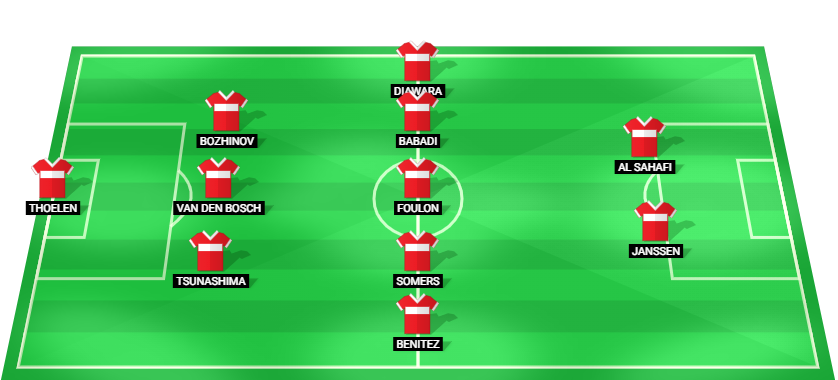 Thoelen (GK), Tsunashima (DF), Van Den Bosch (DF), Bozhinov (DF), Benitez (MF), Somers (MF), Foulon (MF), Babadi (MF), Diawara (MF), Janssen (FW), Al Sahafi (FW)