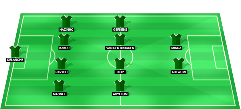 Delanghe (GK), Magnee (DF), Ravych (DF), Kakou (DF), Nazinho (DF), Agyekum (MF), Diop (MF), van der Bruggen (MF), Gerkens (MF), Adewumi (FW), Minda (FW)