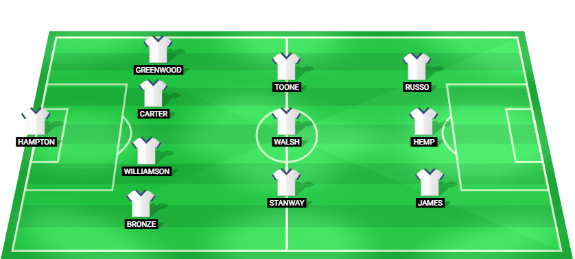 Hampton (GK), Bronze (DF), Williamson (DF), Carter (DF), Greenwood (DF), Stanway (MF), Walsh (MF), Toone (MF), James (FW), Hemp (FW), Russo (FW).