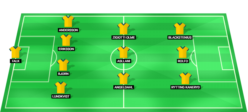 Falk (GK), Lundkvist (DF), Bjorn (DF), Eriksson (DF), Andersson (DF), Angeldahl (MF), Asllani (MF), Zigiotti Olme (MF), Rytting Kaneryd (FW), Rolfo (FW), Blackstenius (FW).