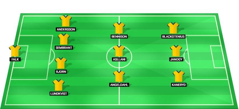 Falk (GK), Lundkvist (DF), Bjorn (DF), Sembrant (DF), Andersson (DF), Angeldahl (MF), Asllani (MF), Bennison (MF), Rytting Kaneryd (FW), Janogy (FW), Blackstenius (FW)