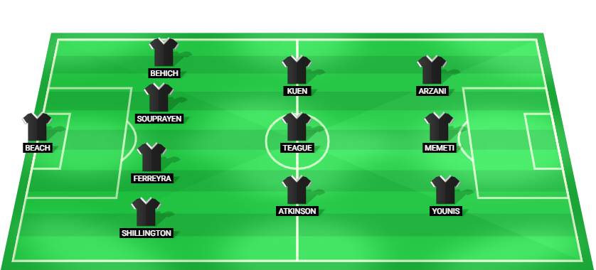 Beach (GK), Shillington (DF), Ferreyra (DF), Souprayen (DF), Behich (DF), Atkinson (MF), Teague (MF), Kuen (MF), Younis (FW), Memeti (FW), Arzani (FW).