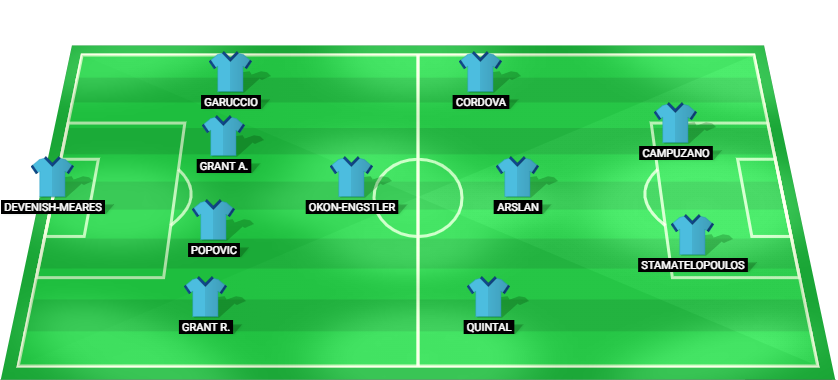 Devenish-Meares (GK), Grant R. (DF), Popovic (DF), Grant A. (DF), Garuccio (DF), Okon-Engstler (MF), Quintal (MF), Arslan (MF), Cordova (MF), Stamatelopoulos (FW), Campuzano (FW).