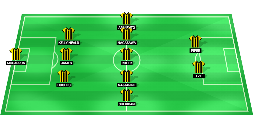 McCarron (GK), Hughes (DF), James (DF), Kelly-Heald (DF), Sheridan (MF), Najjarine (MF), Rufer (MF), Nagasawa (MF), Armiento (MF), Eze (FW), Piper (FW).