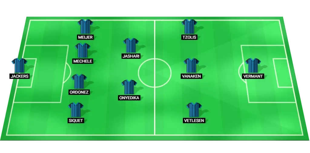 Club Brugge Predicted Lineup (4-2-3-1): Jackers (GK), Siquet (DF), Ordonez (DF), Mechele (DF), Meijer (DF), Onyedika (MF), Jashari (MF), Vetlesen (MF), Vanaken (MF), Tzolis (MF), Vermant (FW)