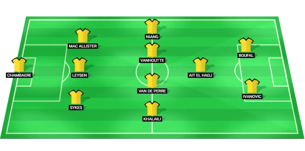 Union SG Predicted Lineup (3-4-1-2): Chambaere (GK), Sykes (DF), Leysen (DF), Mac Allister (DF), Khalaili (MF), Van De Perre (MF), Vanhoutte (MF), Niang (MF), Ait El Hadj (AM), Ivanovic (FW), Boufal (FW)