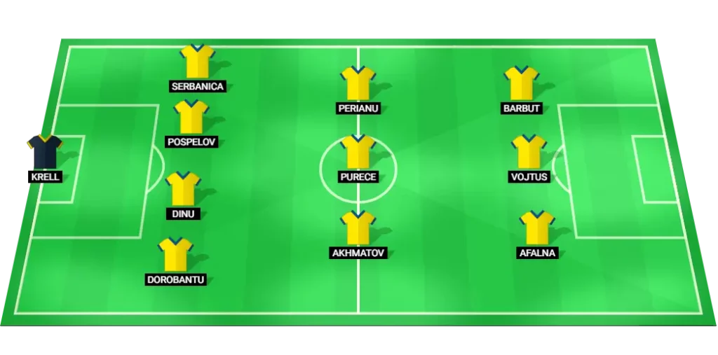 Unirea Slobozia Predicted Lineup: Krell (GK), Dorobantu (DF), Dinu (DF), Pospelov (DF), Serbanica (DF), Akhmatov (MF), Purece (MF), Perianu (MF), Afalna (FW), Vojtus (FW), Barbut (FW)