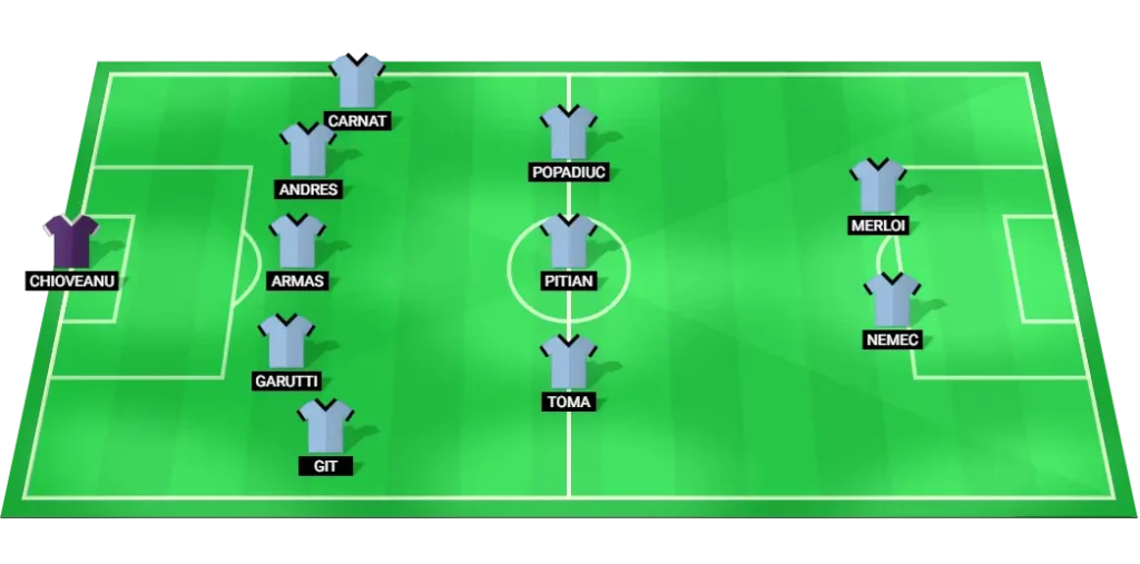 Voluntari Predicted Lineup: Chioveanu (GK), Git (DF), Garutti (DF), Armas (DF), Andres (DF), Carnat (DF), Toma (MF), Pitian (MF), Popadiuc (MF), Nemec (FW), Merloi (FW)