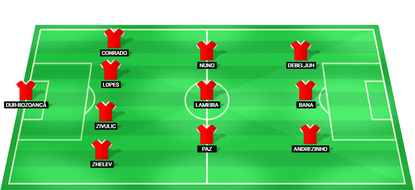 Dur-Bozoanca (GK), Zhelev (DF), Zivulic (DF), Lopes (DF), Conrado (DF), Paz (MF), Lameira (MF), Nuno (MF), Andrezinho (FW), Bana (FW), Debeljuh (FW)