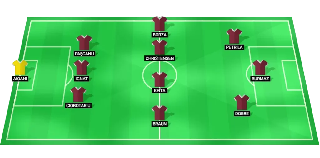 Aioani (GK), Ciobotariu (DF), Ignat (DF), Paşcanu (DF), Braun (MF), Keïta (MF), Christensen (MF), Borza (MF), Dobre (FW), Burmaz (FW), Petrila (FW)