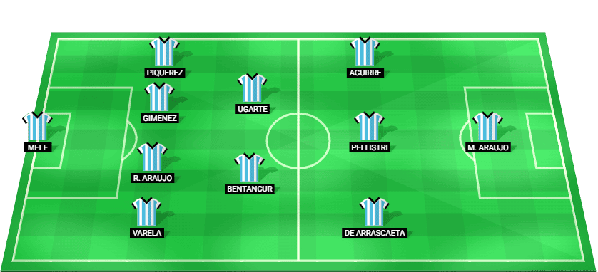 Mele (GK), Varela (DF), R. Araujo (DF), Gimenez (DF), Piquerez (DF), Bentancur (MF), Ugarte (MF), De Arrascaeta (MF), Pellistri (MF), Aguirre (MF), M. Araujo (FW).