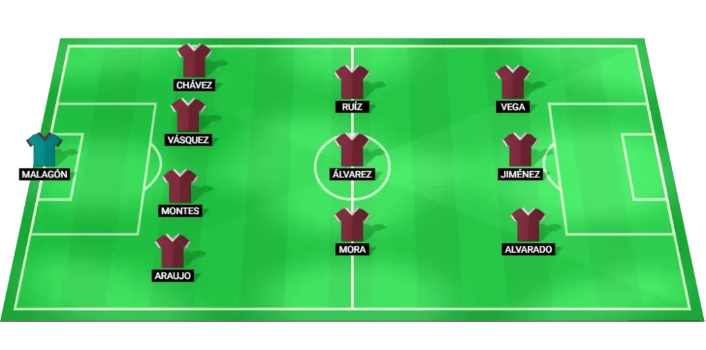 Mexico Predicted Lineup: Malagón (GK), Araujo (DF), Montes (DF), Vásquez (DF), Chávez (DF), Mora (MF), Álvarez (MF), Ruíz (MF), Alvarado (FW), Jiménez (FW), Vega (FW)