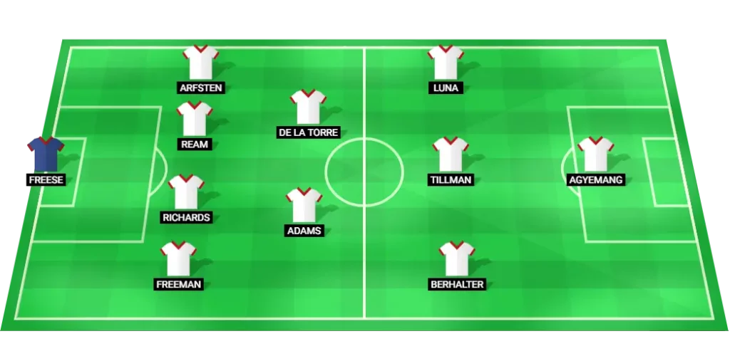 USA Predicted Lineup: Freese (GK), Freeman (DF), Richards (DF), Ream (DF), Arfsten (DF), Adams (MF), De La Torre (MF), Berhalter (MF), Tillman (MF), Luna (MF), Agyemang (FW)