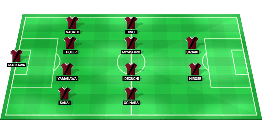 Maekawa (GK), Sakai (DF), Yamakawa (DF), Thuler (DF), Nagato (DF), Ogihara (MF), Ideguchi (MF), Miyashiro (MF), Iino (MF), Hirose (FW), Sasaki (FW).