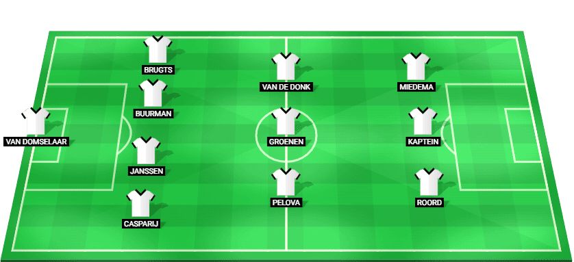 Netherlands W possible starting lineup: Van Domselaar (GK), Casparij (DF), Janssen (DF), Buurman (DF), Brugts (DF), Pelova (MF), Groenen (MF), Van de Donk (MF), Roord (FW), Kaptein (FW), Miedema (FW).