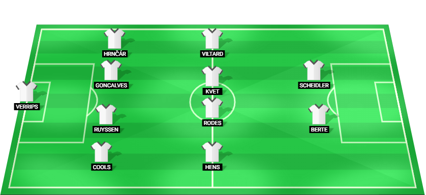 Verrips (GK), Cools (DF), Ruyssen (DF), Goncalves (DF), Hrnčár (DF), Hens (MF), Rodes (MF), Kvet (MF), Viltard (MF), Berte (FW), Scheidler (FW).