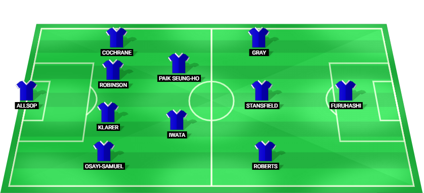 Allsop (GK), Osayi-Samuel (DF), Klarer (DF), Robinson (DF), Cochrane (DF), Iwata (MF), Paik Seung-Ho (MF), Roberts (AM), Stansfield (AM), Gray (AM), Furuhashi (FW)