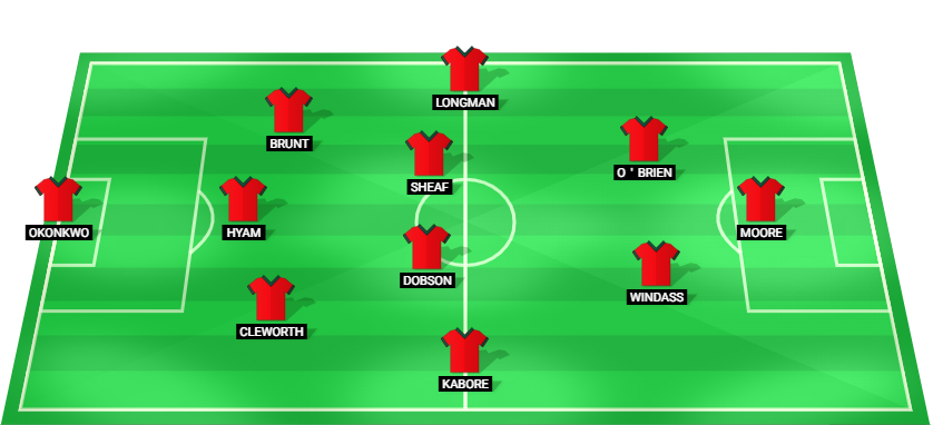 Okonkwo (GK), Cleworth (DF), Hyam (DF), Brunt (DF), Kabore (MF), Dobson (MF), Sheaf (MF), Longman (MF), Windass (AM), O’Brien (AM), Moore (FW)