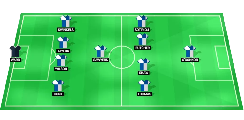 Bristol Rovers Starting XI: Ward (GK), Hunt (DF), Wilson (DF), Taylor (DF), Swinkels (DF), Sawyers (MF), Butcher (MF), Shaw (MF), Thomas (MF), Sotiriou (FW), O’Donkor (FW)