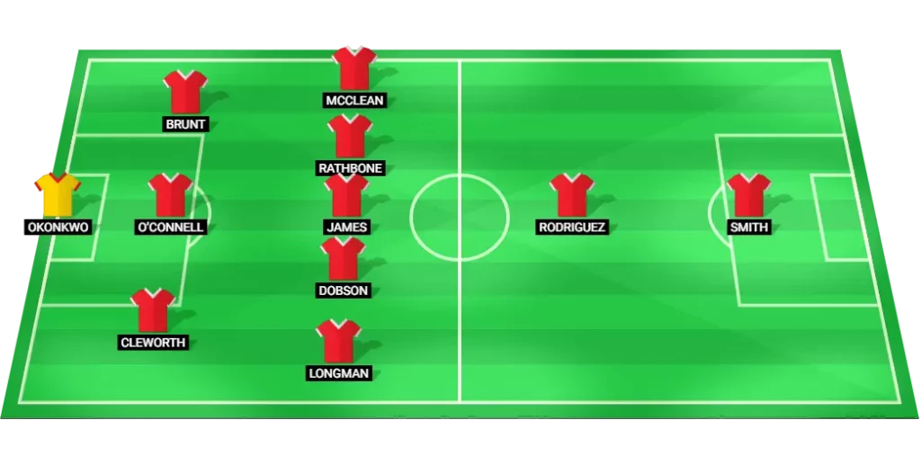 Wrexham Starting XI: Okonkwo (GK), Cleworth (DF), O’Connell (DF), Brunt (DF), Longman (MF), Dobson (MF), James (MF), Rathbone (MF), McClean (MF), Rodriguez (FW), Smith (FW)