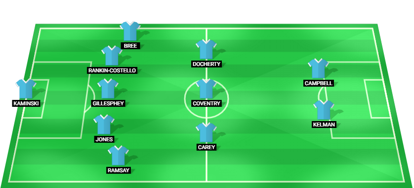 Kaminski (GK), Ramsay (DF), Jones (DF), Gillesphey (DF), Rankin-Costello (DF), Bree (DF), Carey (MF), Coventry (MF), Docherty (MF), Kelman (FW), Campbell (FW)