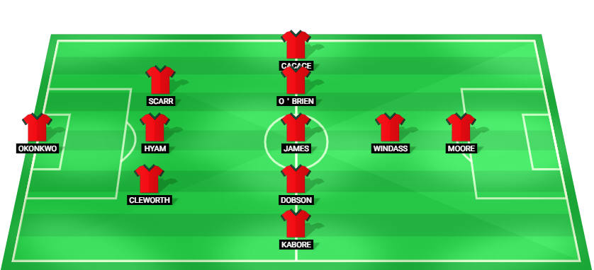Okonkwo (GK), Cleworth (DF), Hyam (DF), Scarr (DF), Kabore (MF), Dobson (MF), James (MF), O’Brien (MF), Cacace (MF), Windass (AM), Moore (FW)