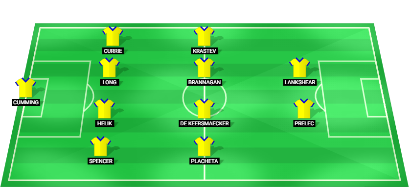 Cumming (GK), Spencer (DF), Helik (DF), Long (DF), Currie (DF), Placheta (MF), De Keersmaecker (MF), Brannagan (MF), Krastev (MF), Prelec (FW), Lankshear (FW).