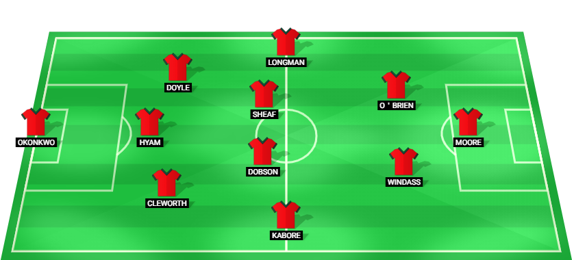 Okonkwo (GK), Cleworth (DF), Hyam (DF), Doyle (DF), Kabore (MF), Dobson (MF), Sheaf (MF), Longman (MF), Windass (AM), O’Brien (AM), Moore (FW).