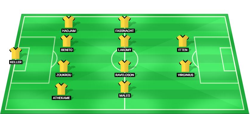 Keller (GK), Athekame (DF), Zoukrou (DF), Benito (DF), Hadjam (DF), Males (MF), Raveloson (MF), Lakomy (MF), Fassnacht (MF), Virginius (FW), Itten (FW).