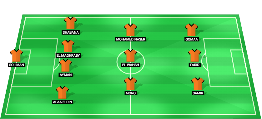 Soliman (GK), Alaa Eldin (DF), Ayman (DF), El Maghraby (DF), Shabana (DF), Moro (MF), El Wahsh (MF), Mohamed Naser (MF), Samir (FW), Farid (FW), Gomaa (FW).