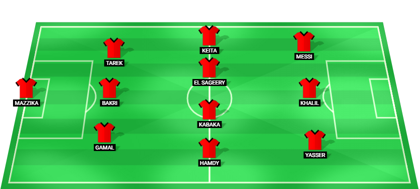 Mazzika (GK), Gamal (DF), Bakri (DF), Tarek (DF), Hamdy (MF), Kabaka (MF), El Sageery (MF), Keita (MF), Yasser (FW), Khalil (FW), Messi (FW).