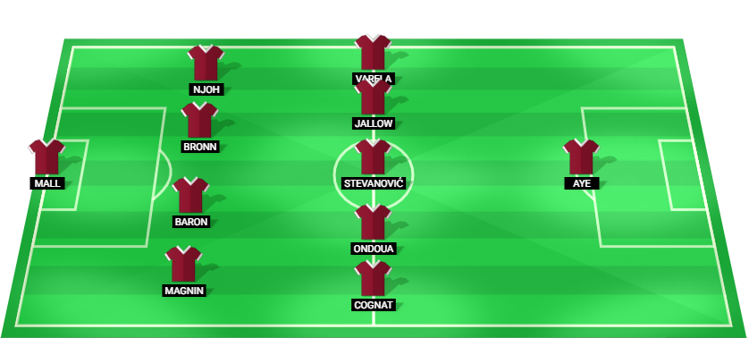 Mall (GK), Magnin (DF), Baron (DF), Bronn (DF), Njoh (DF), Cognat (MF), Ondoua (MF), Stevanović (MF), Jallow (MF), Varela (MF), Aye (FW).
