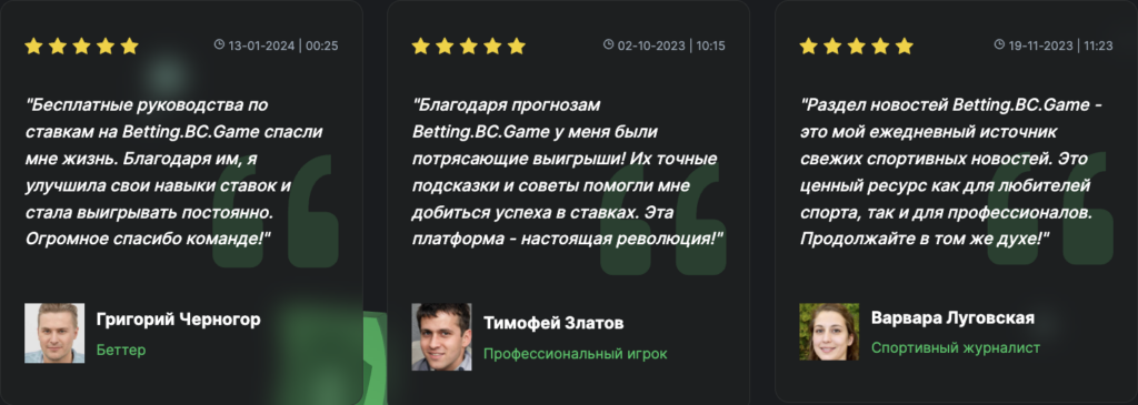 BC Game завоевало доверие тысяч игроков, и это не просто слова. На главной странице сайта Betting.BC.Game пользователи делятся своими впечатлениями, хваля платформу за быстрые выплаты, щедрые бонусы и разнообразие игр. Реальные BC Game отзывы подчеркивают надежность казино, удобство интерфейса и оперативность поддержки. Эти истории, доступные каждому посетителю, показывают, почему наша платформа остается выбором тех, кто ценит честность и качество.