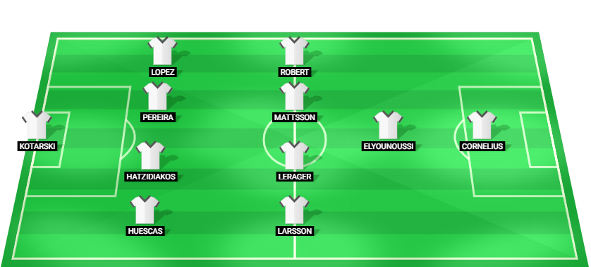 Kotarski (GK), Huescas (DF), Hatzidiakos (DF), Pereira (DF), Lopez (DF), Larsson (MF), Lerager (MF), Mattsson (MF), Robert (MF), Elyounoussi (AM), Cornelius (FW)